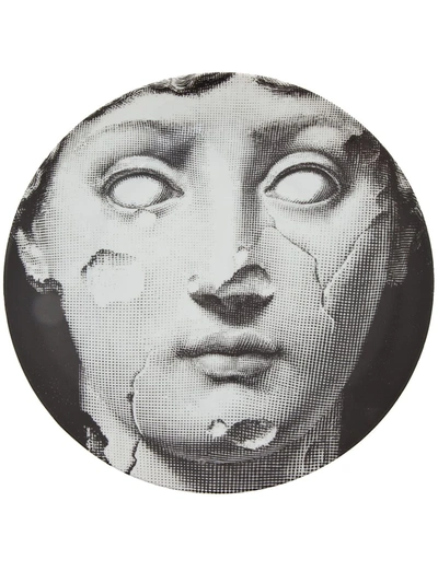 Black porcelain plate from Fornasetti featuring a black and white aged bust print.
