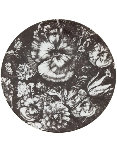 White china plate from Fornasetti featuring a contrasting black floral print design.