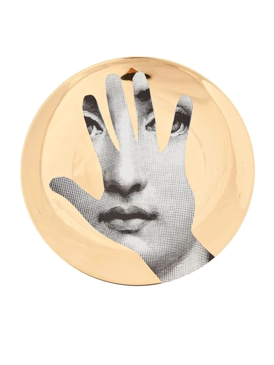 China plate from Fornasetti featuring a gold print with a black and white woman's face inside the outline of a hand.