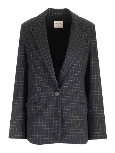 Boxy fit blazer in bright black batavia with lightly padded shoulders and a boxy fit, straight waist, and a lurex windowpane motif from Forte Forte. Composition: 63% PL 33% VI 2% PM 2% lining: 52% VI 48% CO
