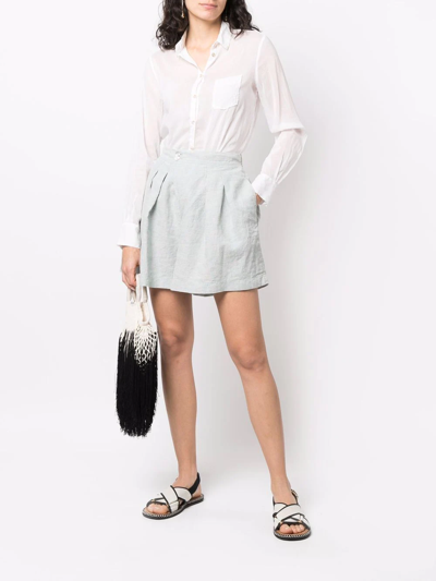 Blue cotton Tweed high-waisted shorts from FORTE FORTE featuring asymmetric design, pleat detailing, high-waisted, button fastening, slip pockets to the sides and rear welt pocket.