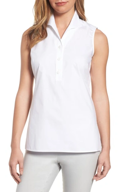 A button-back placket adds an unexpected touch to a crisp cotton shirt with popover styling in a sleeveless silhouette. Style Name: Foxcroft Dani Button Back Shirt (Regular & Petite). Style Number: 5419292. Available in stores.