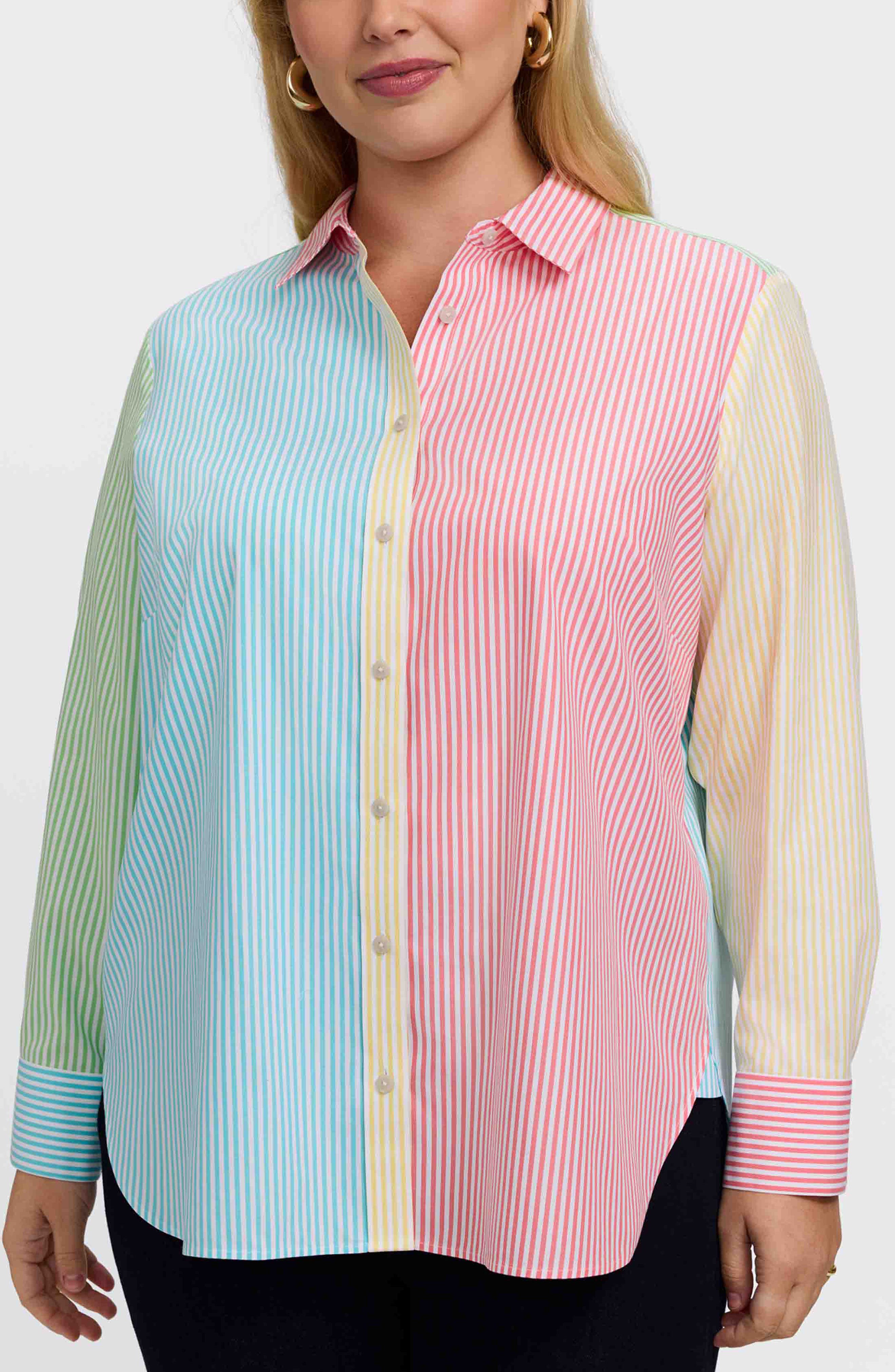 Vibrant multicolored stripes bring lively energy to this crisp cotton button-up blouse styled with a relaxed silhouette for casual comfort. 28 1/2" length Spread collar Long sleeves with button cuffs Front button closure<br> 100% cotton Machine wash, tumble dry Imported