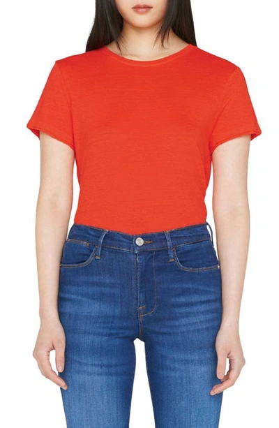 Introducing the 'FRAME Denim Easy True Linen T-Shirt' - a perfect blend of dressed-up casual with European influences. Made by the esteemed brand FRAME Denim, this t-shirt is a standout piece in the women's clothing category, specifically in the shirts & tops section under t-shirts.In a vibrant red-orange color with raw edge trim, this Easy True Linen T-Shirt adds a pop of color to any outfit. Its flattering length, measuring approximately 25 inches from shoulder to hem, ensures a stylish and comfortable fit. The model showcased is 5'11' and is wearing a size small, but please note that measurements can slightly vary by size.Crafted from 100% organic linen, this t-shirt not only looks and feels incredible but is environmentally conscious as well. To maintain its quality, it is recommended to hand wash this garment. As a brand known for its dedication to detail and craftsmanship, FRAME Denim has created a t-shirt that exudes effortless style and sophistication.Bring a touch of European chic to your wardrobe with the FRAME Denim Easy True Linen T-Shirt. Get yours now and experience the perfect combination of comfort, style, and sustainability. Imported for your convenience, this t-shirt is a must-have addition to any fashion-savvy individual's collection.