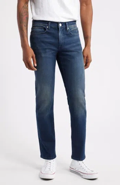 Faded and whiskered stretch denim gives a broken-in finish to casual-cool jeans cut slim through the hips for a modern profile.