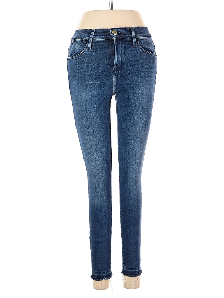 FRAME Jeans, Size: 26. Item Details: Blue, Hearts Pattern, Medium Wash, Skinny Leg, Cropped, Mid/Reg Rise, Women's Bottoms, Organic Cotton/Recycled Polyester/Elastane