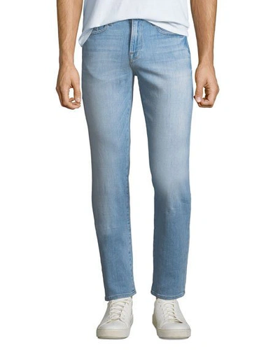 FRAME "L'Homme" classic jeans in Pipestone (medium blue) wash with whiskering and fading. Five-pocket style. Mid rise. Slim fit through straight leg. Button/zip fly; belt loops. Cotton/polyester/spandex. Machine wash. Made in Mexico.