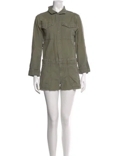FRAME Romper Green Raw-Edge Trim Long Sleeve with Collar Button Closure at Front Fit: Jumpsuits and Rompers by FRAME typically fit true to size. | FRAME Romper in Green, Women's XS