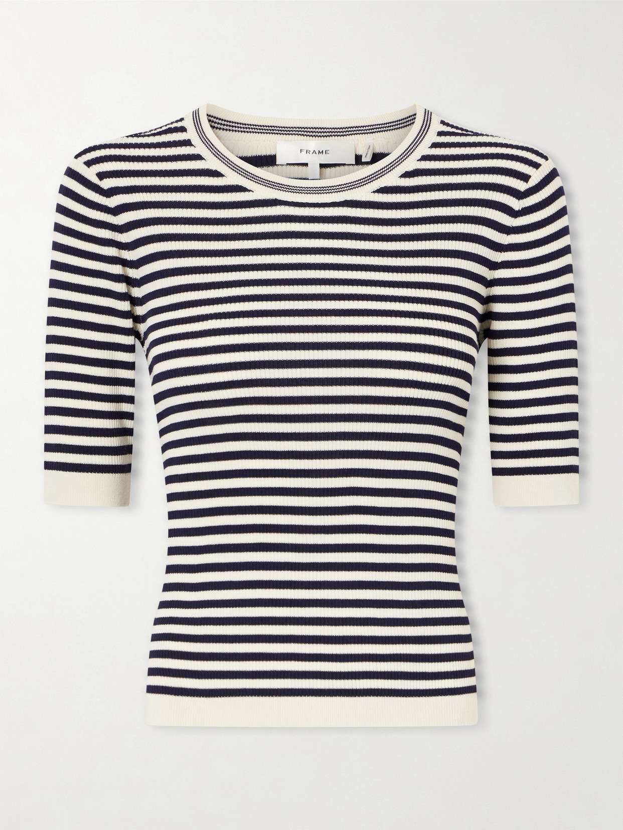 Delightful puff sleeves sweeten the silhouette of this soft cotton-modal sweater knit with lively stripes and anchored by solid ribbed trim. 21" length Crewneck Short sleeves 50% cotton, 50% modal Dry clean Imported