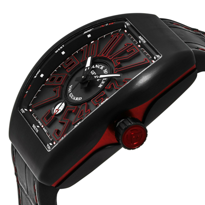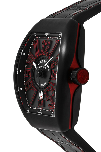 Franck Muller graduated from the renowned watchmaker's school in Geneva, his hometown. Although he began producing watches a decade earlier, it was only in 1991 that he established the company that bears his name. Franck Muller is an accomplished and highly-skilled watchmaker that produces some exceptional timepieces, most of which are of limited edition. Case: Sandblasted black titanium, with red accents Case back: Titanium, screw-in Bezel: Sandblasted black titanium Dial: Black Hands: Black, luminescent Markers: Black Arabic numerals, with a red outline Calendar: Date display window at the 6 o'clock position Strap: Black leather, with a rubber backing and red stitching Clasp: Push-button deployment Crystal: Sapphire Crown: Screw-down Movement: Swiss automatic-mechanical Power reserve: 42 hours Case measurements: 44 mm wide x 53.7 mm long x 13.5 mm thick Strap measurements: 29 mm wide x 8 inches long Model: 45SCBLKBLKRED All measurements are approximate and may vary slightly from the listed dimensions. Autom
