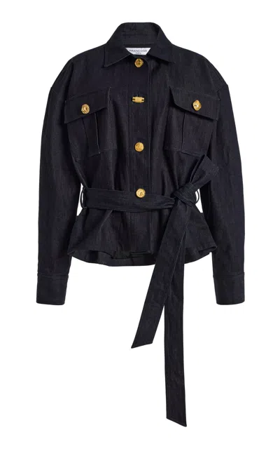 Designer Johanna Senyk is reinventing upcycled fashion; sourcing deadstock fabrics from European fashion houses to craft era-transcending pieces. “Recycling is only worthwhile if you create quality pieces that stand the test of time; Senyk explains. This is a dark denim jacket accented with oversized gold buttons and a tie-around belt at the waist. The design is structured yet relaxed; giving a polished edge to an otherwise classic silhouette.