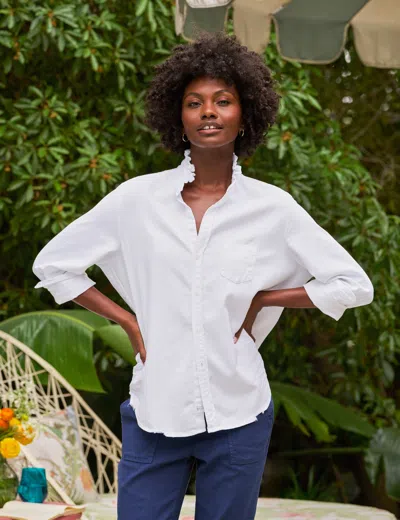 Eileen is our best-selling button-up for a reason. Easy to wear, airy on the body, and ridiculously flattering with our signature button placement, we’ve added a gorgeously feminine ruffled collar to dress up an already iconic piece. Shop at Frank & Eileen for Women's Ruffle Collar Button Up Shirt, Eileen Ruffle, Famous Denim, Available in Size M, White.