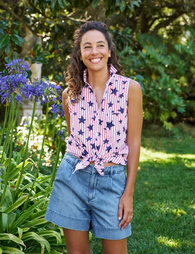 Finley will be your layering hero! This sleeveless style solves the “what do I wear under my sweater?” issue, giving you all the look of a button-up without the bulk! Pop Finley under your Monterey or any favorite Triple Fleece pieces to create a beautifully layered, forever classic look that covers your bum. Shop at Frank & Eileen for Women's Sleeveless Layering Button Up Shirt, Finley, Superluxe, Available in Size L, Navy, Red.