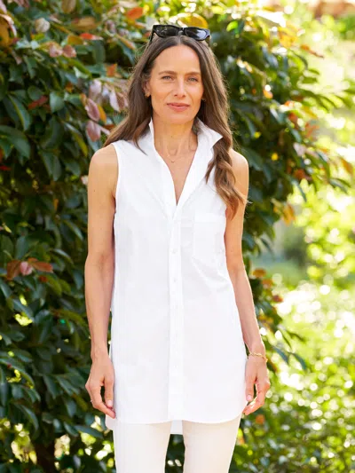 Finley will be your layering hero! This sleeveless style solves the “what do I wear under my sweater?” issue, giving you all the look of a button-up without the bulk! Pop Finley under your Monterey or any favorite Triple Fleece pieces to create a beautifully layered, forever classic look that covers your bum. Shop at Frank & Eileen for Women's Sleeveless Layering Button Up Shirt, Finley, Superluxe, Available in Size L, White.