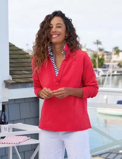 Our runaway hit Popover Henley has a slight drop sleeve, sporty v-neck, and straight raw-cut hem that looks cropped without sacrificing any length or coverage. This piece takes you from running laps to lunch, from beach walks to brunch... Shop at Frank & Eileen for Women's Popover Henley, Patrick, Triple Fleece, Available in Size L, Red.