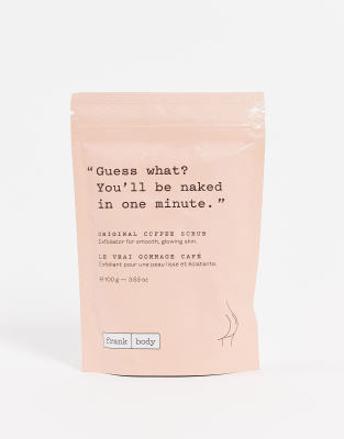 Body care by Frank Body The unsung skincare hero Original coffee scrub Targets breakouts, scars, cellulite and stretch marks Formulated with a blend of coffee, vitamin E and antioxidant-rich oils Coffee helps to exfoliate for smooth, glowing skin Cold-pressed sweet almond oil leaves skin feeling hydrated even after rinsing the scrub off Vitamin E promotes healing and fading scars Sea salt helps to exfoliate dry, flaky skin without irritation Product is non-returnable for hygiene reasons