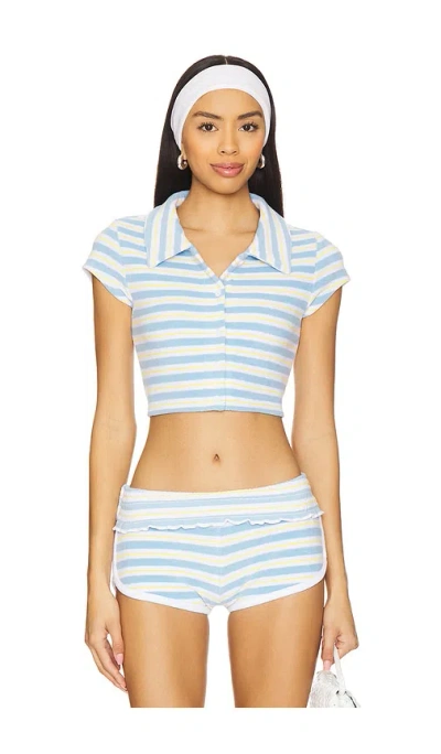 Frankies Bikinis Laurel Button Up Top in Baby Blue. - size S (also in L, M) Frankies Bikinis Laurel Button Up Top in Baby Blue. - size S (also in L, M) 79% cotton 15% polyester 6% spandex. Made in China. Machine wash. Front button closure. Cropped fit design. Terrycloth fabric. Item not sold as a set. FRBI-WS72. 33254TC. Malibu made, Frankie's Bikinis are the inspired creations of Francesca Aiello, drawing from natural wonders like the Hawaiian shoreline and the California cost. The born and bred California girl designs each piece with the sun kissed surfer girl in mind. Her designs are functional but fashionable featuring flirty accents, low cuts and high-quality materials. Frankie's Bikinis were made for soaking up sun, hitting the waves or just enjoying the perfect beach day.