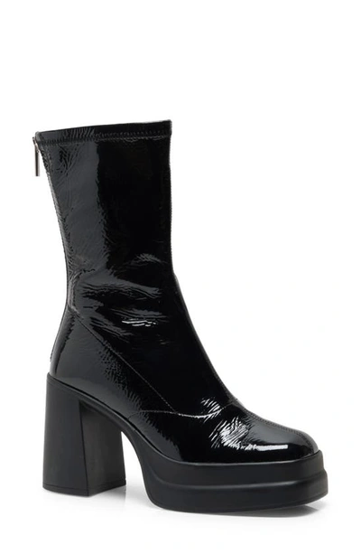 A patent finish brings high shine to this leather bootie that sits atop a stacked platform with a tall block heel.
