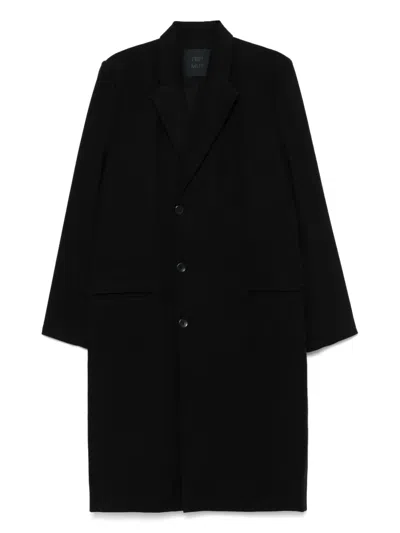 single-breasted wool coat from Frei-Mut featuring black, wool, notched lapels, front button fastening, long sleeves, two side patch pockets, knee-length and straight hem.
