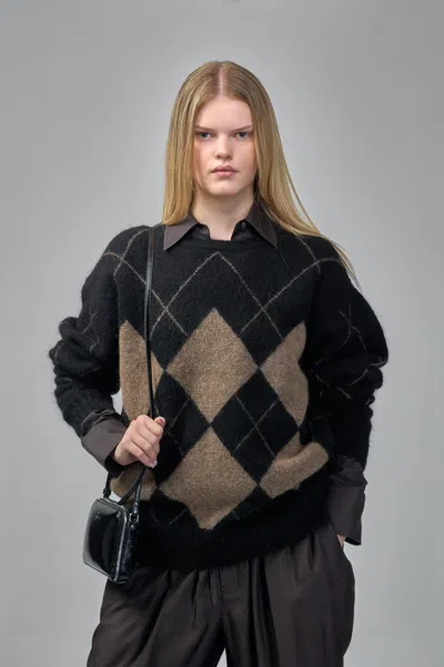 Frenken sweaters redefine contemporary knitwear with this striking argyle jumper. Featuring oversized tan diamond patterns against a rich black base. Crafted from luxurious fuzzy knit for ultimate comfort and style. Sweaters in a fuzzy black knit featuring oversized tan argyle diamonds across the front. It has a crew neckline, ribbed hem and cuffs, and a relaxed, slightly oversized silhouette. Fuzzy mohair-like knit Large tan argyle diamonds Crewneck collar Ribbed hem and cuffs Dropped shoulder construction Long loose sleeves Relaxed boxy silhouette Black base color