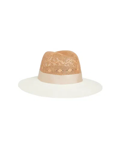 The Camellia Hat in Sand and Natural by Freya is a finely woven panama hat crafted from two distinct weaves of Paja Toquilla straw.. 8cm brim. Each hat is unique due to the handcrafted process. Small/Medium: 55cm-57cm. .