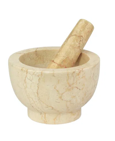 The "Jupiter" Marble Mortar Pestle 4" H is crafted from a single piece of natural marble for lasting durability. Its untreated interior enhances grinding efficiency, while the polished exterior highlights the elegant ivory and champagne hues of the marble.