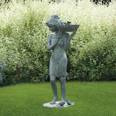 A barefoot beauty and three birds gather around the Ana Spring Birdbath, cast of aluminum with aged verdigris finish. A classic statement to bring birds on the wing to your garden. Cast aluminum construction with verdigris finish . Actual birdbath is 9-3/4" diameter, tapering to 3-3/4" diameter .