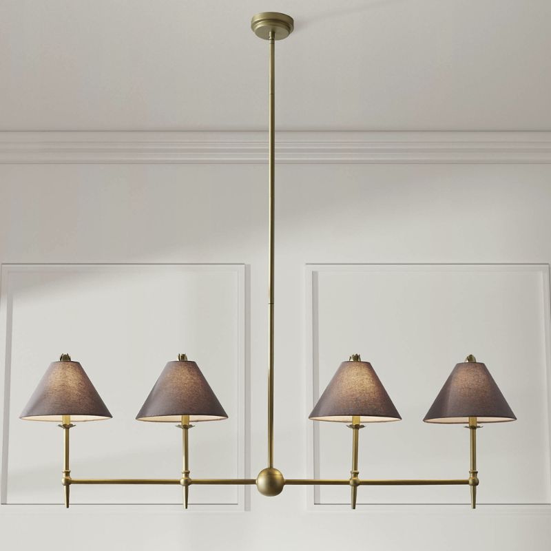 Featuring a sleek and simple profile, this chandelier is crafted of aluminum and iron with a floral bobeche on the base and a matching floral-inspired finial. Aluminum and Iron with brass finish. Gray linen shades clip on to bulb. 5" dia. ceiling plate. Four E12 sockets. Candelabra bulb type. Accommodates bulb up to 40W or equivalent (not included). For a brighter light, we suggest using a higher-lumen LED bulb. However, do not exceed recommended wattage.. Includes four rods: one 6", two 12" and one 18". Hardwire design; professional installation recommended. For indoor use. Dust with soft, dry cloth. Imported. A Frontgate exclusive. At Frontgate, our primary focus is quality. We guarantee that every product we sell will stand up to the supreme test our customers' satisfaction. To learn more about our policies, visit our Shipping & Processing, Returns & Exchanges and Warranty & Price Guarantee pages.