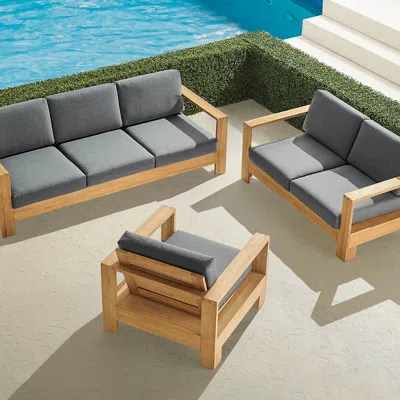 With its wide-plank arms and comfortably angled seatbacks, our Boretto Teak Sofa Set combines generous proportions with impeccable style. Frames are handcrafted from high-quality teak that has been kiln dried to eliminate expansion and shrinkage. Included cushions are upholstered in 100% solution-dyed acrylic fabric. Set includes either:. Sofa, loveseat and lounge chair with cushions. Sofa and two lounge chair with cushions. Hand-built from sustainably harvested, high-quality teak that is naturally resistant to mildew, so it holds up to rain and humidity. Durable teak frames are kiln dried to remove moisture, guarding against warping and cracking, and sanded by hand so theyre smooth to the touch. Over time, teak will develop a natural silver patina if left untreated. Includes seat cushions and back cushions. All-weather cushions have a high-resiliency foam core wrapped in plush polyester. 100% solution-dyed fabric resists mold, mildew and fading - and is easy to clean. Cushions also available with 100% waterproof Sunbrella Rain performance fabric. Frames are backed by an industry-leading 10-year structural warranty. Also available in Dove Aluminum finish. Arrives assembled. Imported . A Frontgate exclusive. At Frontgate, our primary focus is quality. We guarantee that every product we sell will stand up to the supreme test our customers' satisfaction. To learn more about our policies, visit our Shipping & Processing, Returns & Exchanges and Warranty & Price Guarantee pages.