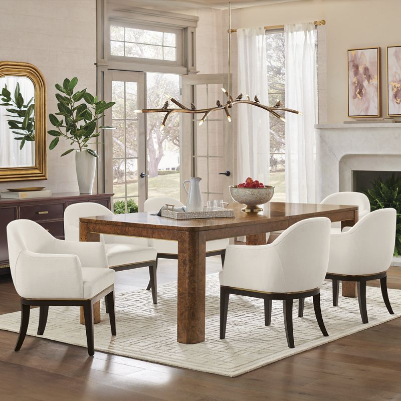 <div class="updp-details-container">This dining set features a Brando Rectangular Extendable Dining Table with eight dining chairs of your choice. The dining table is crafted of solid hardwood with Mappa burl veneer, allowing the beautiful swirls of the burl to come through. Four gently rounded center legs create a pedestal-style base, offering extra legroom around the table. Choose from Angelina, Alana or Blanchett dining chairs (see details below).Set includes dining table and eight dining chairs (your choice of Angelina, Alana or Blanchett). Brando Rectangular Extendable Dining TableCrafted of Mahogany hardwood and engineered wood. Mappa burl veneer in a Russet finish. Brass-plate apron and foot. Comfortably seats eight adults; extends to comfortably seat 12 adults.. Includes two 16-inch leaf extensions. Generously scaled legs. Nonmarring floor levelers. . Angelina Dining ChairIron frame finished in Antique Textured Brass. Ivory Linen Parks Performance fabric. Performance fabric resists stains and repels water and oils, ensuring easy cleaning.. High-density foam cushion. Handcrafted finishing details. Handle on seatback makes it easy to pull chair away from the table. Nonmarring foot glides. . Alana Dining ChairIron legs finished in Satin Brass. Snow Nomad Crypton Performance fabric. Plush Crypton performance fabric offers everyday stain, moisture and odor protection.. Upholstered seat and backrest. High-density foam cushions surrounded with fiberfill and a polyester wrap for maximum comfort. Nonmarring plastic foot glides and adjustable leveler feet. . Blanchett Dining ChairHardwood frame finished in Sable. Kiln-dried solid hardwood frame constructed with mortise-and-tenon joinery for lasting durability.. Ivory Linen Parks Performance fabric. Performance fabric resists stains and repels water and oils, ensuring easy cleaning.. High-density foam cushion surrounded with fiberfill and a polyester wrap for maximum comfort. Hand-set metal trim along base of seat. Nonmarring plastic foot glides. . Dining table requires assembly; dining chairs arrive assembled.. Imported. A Frontgate exclusive.At Frontgate, our primary focus is quality. We guarantee that every product we sell will stand up to the supreme test our customers satisfaction. To learn more about our policies, visit our Shipping & Processing, Returns & Exchanges and Warranty & Price Guarantee pages.