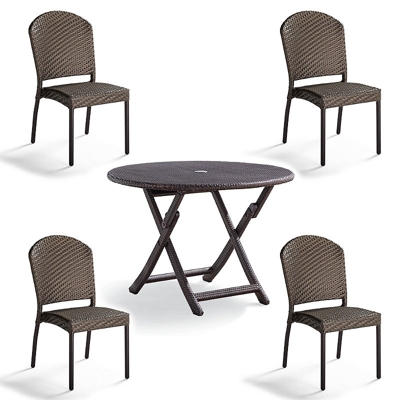 Featuring comfort you can fold, stack and store, our Cafe Table and Stacking Side Chairs set up instantly for guests. The chairs are comfortably scaled and feature weather-defying wicker woven over aluminum frames and they stack together to store neatly away. Set includes four stacking side chairs and a 41" round folding table. All-weather wicker is handwoven over a powdercoated aluminum frame. Premium wicker construction resists mold, mildew, fading and splintering. Durable yet lightweight aluminum frame is finished with a protective powdercoat to resist the elements. Table has 2" umbrella hole. Stacks for space-saving storage. Cushions sold separately. All-weather cushions have a high-resiliency foam core wrapped in plush polyester . Easy-to-clean 100% solution-dyed fabric resists mold, mildew and fading. Cushions also available with 100% waterproof Sunbrella Rain performance fabric. Imported. A Frontgate exclusive