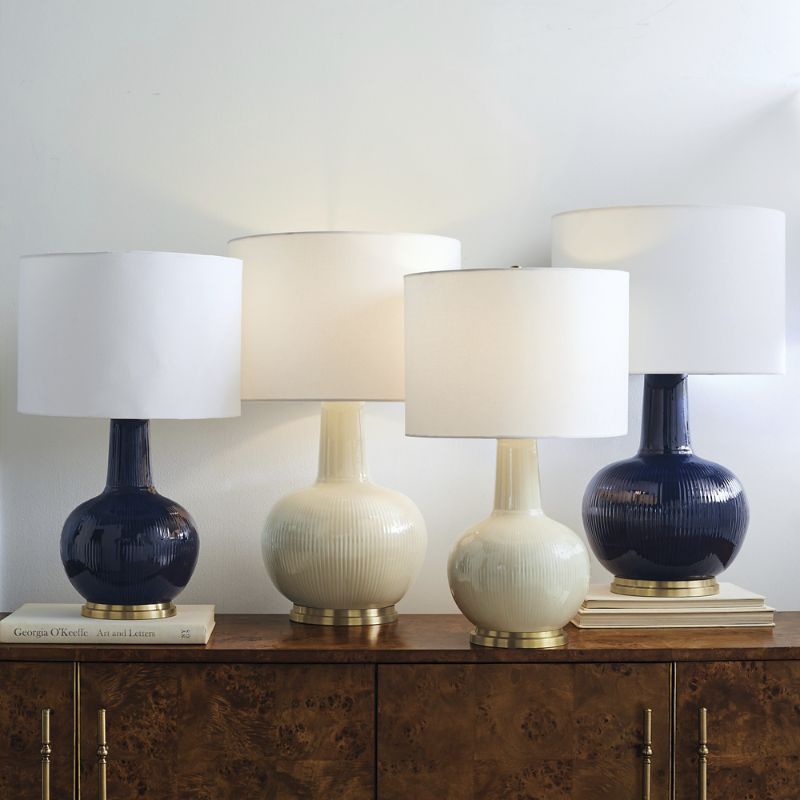 This lamp features a subtly ribbed design, giving the glazed ceramic body a little extra texture and striping. Includes a white linen drum shade.Glazed ceramic bodyBrushed brass base and hardwareDimmer switch6-1/2 ft. power cord Takes standard 60-watt bulb or equivalent (sold separately)For indoor useImported. A Frontgate exclusive.
