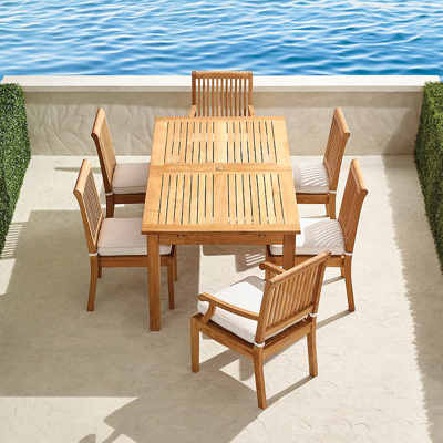 Our Cassara Dining Collection offers a full menu of options to suit your space, with additional pieces to create a complete outdoor dining experience. Each piece is handcrafted of high-quality teak that has been kiln dried to eliminate expansion and shrinkage. Stainless steel hardware is fully concealed, so nothing interrupts the clean, smooth lines. Optional cushions are covered in the industrys best all-weather fabrics. Hand-built from sustainably harvested, high-quality teak that is naturally resistant to mildew, so it holds up to rain and humidity. Durable teak frame is kiln dried to remove moisture, guarding against warping and cracking, and sanded by hand so its smooth to the touch. Teak naturally releases resinous oils as it weathers; using a rug is recommended to help prevent staining of deck or patio surfaces. Finely sanded finish . Fully-concealed stainless steel hardware . Teak will develop a lovely silver patina if left untreated . Slatted seats and backs . Side chairs stack for storage . Tables with 2" dia. umbrella hole and cap . Cushion sold separately . 100% solution-dyed and woven fabrics . Cushions have a high-resiliency foam core wrapped in plush polyester . Cushions also available with 100% waterproof Sunbrella Rain performance fabric . Assembly required, Extending Dining Set . Imported/USA .