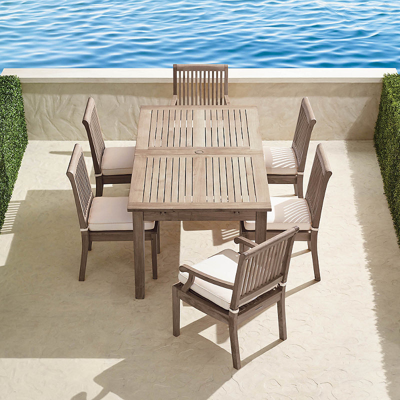 Our Cassara Dining Collection offers a full menu of options to suit your space, with additional pieces to create a complete outdoor dining experience. Each piece is handcrafted of high-quality teak that has been kiln dried to eliminate expansion and shrinkage. Stainless steel hardware is fully concealed, so nothing interrupts the clean, smooth lines. Optional cushions are covered in the industry s best all-weather fabrics. Hand-built from sustainably harvested, high-quality teak that is naturally resistant to mildew, so it holds up to rain and humidity. Durable teak frame is kiln dried to remove moisture, guarding against warping and cracking, and sanded by hand so its smooth to the touch. Teak naturally releases resinous oils as it weathers; using a rug is recommended to help prevent staining of deck or patio surfaces. Finely sanded finish . Fully-concealed stainless steel hardware . Teak will develop a lovely silver patina if left untreated . Slatted seats and backs . Side chairs stack for storage . Tables with 2" dia. umbrella hole and cap . Cushion sold separately . 100% solution-dyed and woven fabrics . Cushions have a high-resiliency foam core wrapped in plush polyester . Cushions also available with 100% waterproof Sunbrella Rain performance fabric. Assembly required . Imported/USA . Please note: Digital renderings of custom upholstery may differ in pattern placement from the actual item. Because colors can vary from screen to screen, we recommend ordering a swatch before completing your order. We offer free swatches of all our outdoor fabrics. 10-swatch maximum. Solid and stripe swatches measure 4"x4" and pattern swatches measure 8"x8". View and order swatches here.