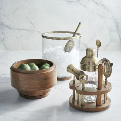 <div class="updp-details-container">An eye-catching addition to any home bar, the Chef Symon Bar Tool Set is sure to spark conversation whenever you entertain. It features a wood lazy Susan base, a ribbed glass cocktail shaker, a full set of brass finished stainless steel bar tools and a removable glass lid that cleverly doubles as an ice bucket.Crafted of walnut-finished mango wood and glass. Brass finished stainless steel tools. Bar Tool Set includes Cocktail Shaker, Muddler, Jigger, Bottle Opener, Stirring Spoon, Ice Scoop & Strainer. Lazy Susan base ensures every tool is easily accessible. Glass lid also functions as ice bucket for added versatility. All items are food safe. Hand wash only. Indoor or outdoor use. At Frontgate, our primary focus is quality. We guarantee that every product we sell will stand up to the supreme test our customers satisfaction. To learn more about our policies, visit our Shipping & Processing, Returns & Exchanges and Warranty & Price Guarantee pages.