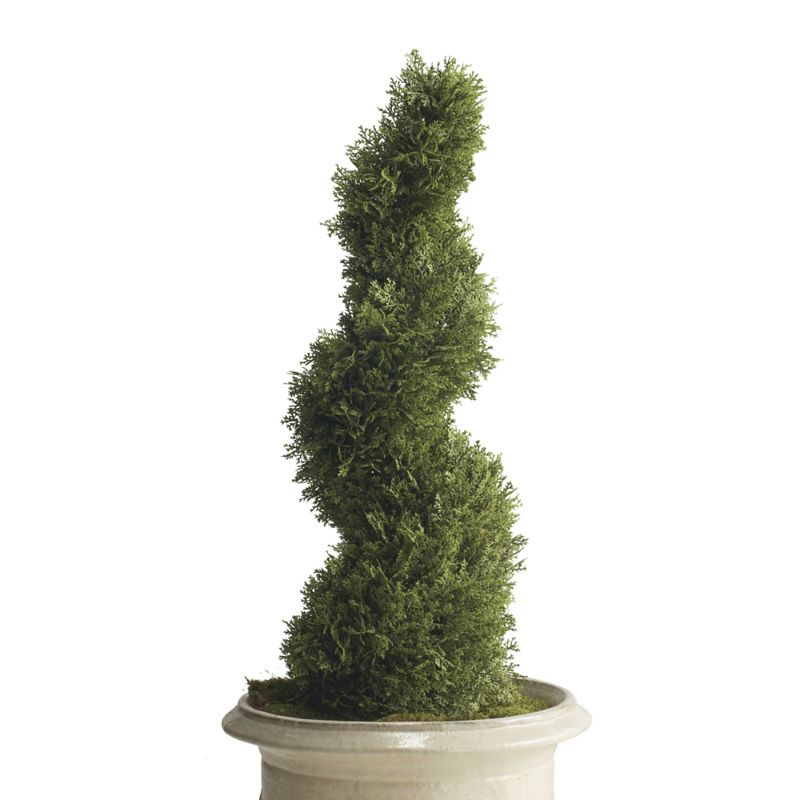 This creative topiary highlights an interesting, yet classic, spiral design of lush greens. Standing 3 feet high, the cypress is shaped to bring unique flair and texture to outdoor entranceways, patios, pools or also any room inside. For indoor or outdoor use . Realistic cypress plant. UV treated for outdoor use. Black plastic nursery pot (10" dia. x 10"H). Fluff and shape greenery after unpacking. Wipe with a soft, dry cloth. Imported.