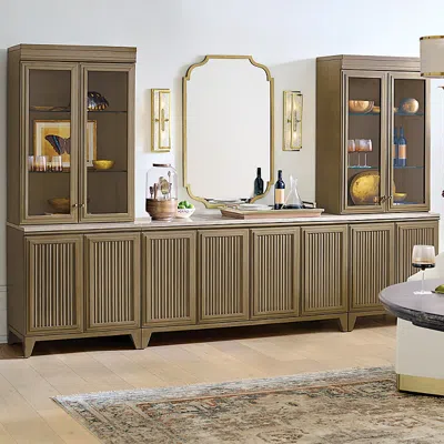 <div class="updp-details-container">Influenced by classic elements from Greek and Roman architecture, our Dillon Modular Collection provides a refined storage solution for a dining room or study. Stepped molding and fluted door panels bring clean-lined dimension while the Crema Marfil marble countertops elevate the elegance. These modular cabinets can be arranged and rearranged to create your ideal configuration with the look of custom, built-in cabinetry.Oak and engineered wood with oak veneer. Willow finish. Stepped molding profiles and fluted door panels. Finished on all sides. Maximum drawer capacity: 30 lbs.. Maximum shelf capacity: 30 lbs.. Indoor use only. Included anti-tip kit is required for installation; kit consists of safety-tested mounting hardware, a nylon strap and instructions. To prevent injuries from furniture tipping over, this item must be permanently affixed to the wall; professional installation is recommended. To prevent injuries or damage to item, recommended team lift (two or more people) for furniture placement. Assembly required for Top Cabinet only. Dillon 32" Base Cabinet with Doors:Crema Marfil marbletop. Due to natural variations in marble, each piece is inherently unique. Two doors. One Drawer. One removable shelf, flat on one side and slotted on the other for wine bottle storage. Doors feature a push-latch mechanism. Dillon 64" Base Cabinet with Doors:Crema Marfil marbletop. Due to natural variations in marble, each piece is inherently unique. Four doors. Two Drawers. Two removable shelves, flat on one side and slotted on the other for wine bottle storage. Doors feature a push-latch mechanism. Dillion 32" Top Cabinet with Glass Doors:Two adjustable clear glass shelves. Faux key and escutcheon hardware with an antiqued burnished brass finish. Interior LED lighting. Includes top profile. A Frontgate exclusive.At Frontgate, our primary focus is quality. We guarantee that every product we sell will stand up to the supreme test our customers satisfaction. To learn more about our policies, visit our Shipping & Processing, Returns & Exchanges and Warranty & Price Guarantee pages.