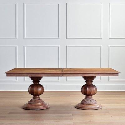 Inspired by antique finds from turn-of-the-century European farmhouses, the Dolcetto Expandable Dining Table infuses your dining room with a sense of old-world romance. Ornately crafted with color variations that showcase the woods natural beauty. Finished with two handcarved pedestal bases, this piece is simple, yet sophisticated, and effortlessly elegant. Top and base are mahogany wood with an oak veneer. Ornately carved solid wood bases. Rustic finish with contrasting inlay. Includes two 18-inch leaves (table extenders). Comfortably seats 8 to 12 guests. Nonmarring floor glides. Wipe with a clean, soft, dry cloth. A light application of furniture polish or wax may be used to restore the woods finish; to protect the finish, avoid the use of all chemicals and harsh abrasives. Some assembly. Imported. A Frontgate exclusive.