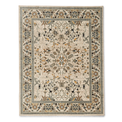 With a soft, intriguing palette of light juniper, gold, gray and teal, this medallion rug is loomed from a blend of high-quality triexta and polyester fibers. Features finished edges and a half-inch pile to ensure softness underfoot. High-quality triexta and polyester blend. Main color: Light Juniper; accent colors: gold, gray, teal and indigo. Finished edges. Half-inch pile . For indoor use. Rug pad (sold separately) recommended for increased cushion and to help hold in place. Vacuum regularly. Made in USA. A Frontgate exclusive.