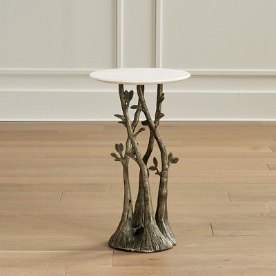 Beautifully detailed on all sides, our Elowen Drink Table is a stunning statement piece in any setting - indoors or outside. Sculpted by hand and then crafted from cast aluminum, this functional work of art features a base of spiraling branches that holds a marble tabletop. Aluminum table is cast from a mold handcrafted by artisans. Antiqued brass finish. Marble tabletop with a bottom chamfered edge. For indoor and outdoor use. Due to natural variations in marble, each piece is inherently unique. Clean marble with a soft cloth. Arrives assembled . A Frontgate exclusive.