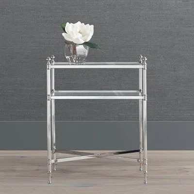 Classic finials, reeded legs, beveled glass and an X-shaped stretcher create a piece with timeless design and limitless uses. Our Frontgate Resort Collection End Table functions beautifully as an end table in the living room or nightstand in the bedroom. Choose a Chrome or Satin brass finish for the iron frame.Part of the Frontgate Resort Collection Iron frame. Chrome or Satin Brass finish. Tiered tempered beveled glass. Adjustable feet for leveling. Coordinates with the Frontgate Resort Collection Bath Furnishings. Assembly required. A Frontgate exclusive.At Frontgate, our primary focus is quality. We guarantee that every product we sell will stand up to the supreme test our customers satisfaction. To learn more about our policies, visit our Shipping & Processing, Returns & Exchanges and Warranty & Price Guarantee pages.