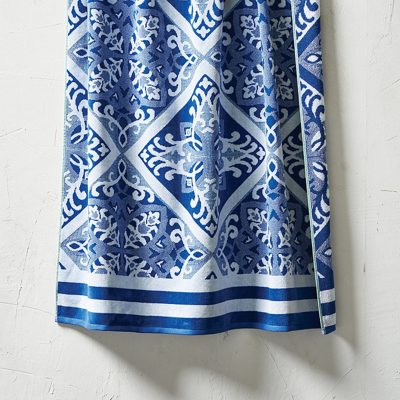 The Resort Estado Tile Beach Towel takes cues from classic blue and white designs that transport you to sun-soaked rivieras. Pair it with other outdoor patterned furniture items in our collection for a coordinated look. 100% cotton. Jacquard woven. 450 gsm for a plush and absorbent feel. Machine wash cold; tumble dry low. Made in Portugal . A Frontgate exclusive.