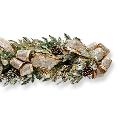 The festive sparkle of glittered picks, shimmering ribbon, gold ornaments and gilded pine cones is only enhanced by 100 warm white LED lights. Every element in the 6 ft. Gilded Elegance Garland is arranged by hand for exceptional depth and dimension. A dazzling addition to any room, this cordless design is part of the Gilded Elegance Greenery Collection, which you can build on year after year. For indoor or covered outdoor use . Plastic, shatterproof ornaments, polyester ribbon and natural pine cones. Handcrafted . 100 warm white LED lights. Use the built-in timer option to automatically turn the lights on for eight hours and off for 16 hours. Requires three "D" batteries (not included). Fluff and shape greenery after unpacking . Wipe clean with a soft, dry cloth or duster. Imported. Part of the Gilded Elegance Greenery Collection. Coordinates with the Gilded Radiance Indoor Greenery Collection. Protect your banister with Garland Ties. A Frontgate exclusive.