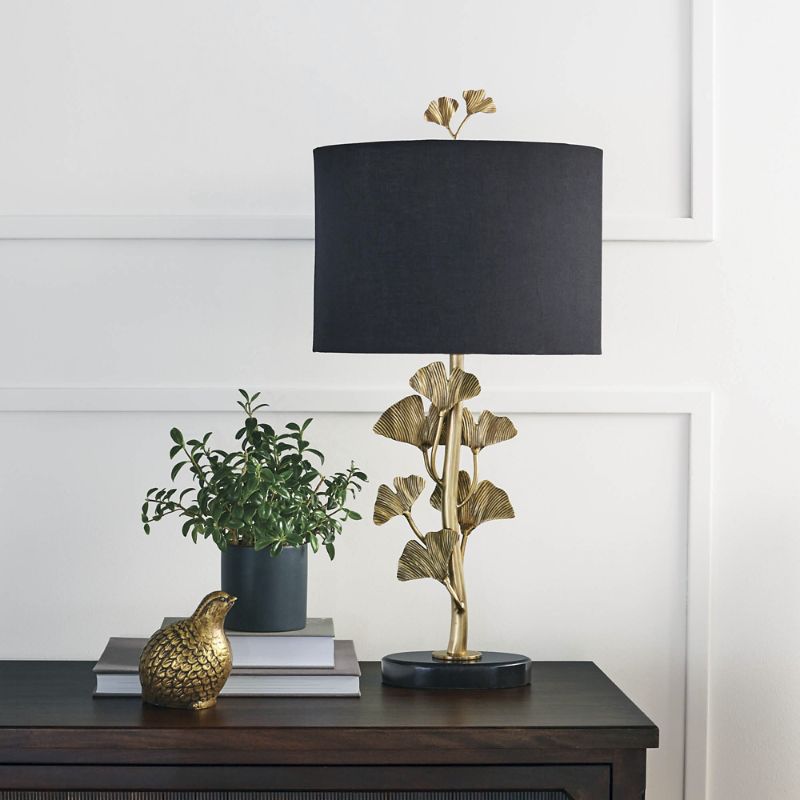 A beautiful set of hand-welded gingko leaves winds around a branch attached to a black marble base. Includes an oval black linen shade.Beautiful hand-welded gingko leaves in brass on a marble base. Due to natural variations in marble, each piece is inherently unique. Oval black linen shade. Takes one standard 60-watt or LED equivalent bulb (sold separately). Dimmer switch. A dimmable LED bulb is required for the dimmer switch function; all incandescent bulbs are dimmable. 6 ft. fabric-wrapped cord. Wipe clean with a soft, dry cloth. Imported. A Frontgate exclusiveAt Frontgate, our primary focus is quality. We guarantee that every product we sell will stand up to the supreme test our customers' satisfaction. To learn more about our policies, visit our Shipping & Processing, Returns & Exchanges and Warranty & Price Guarantee pages.