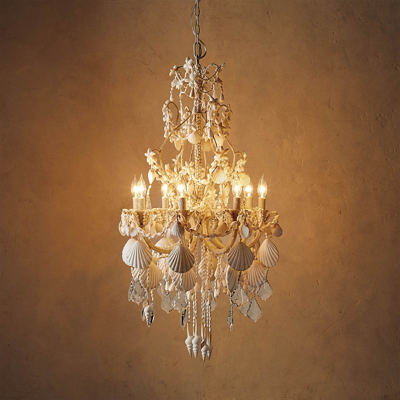 An ethereal symphony of cascading crystals and seashells, our Harbor Shell Chandelier casts a captivating note in any space. The exclusive, all-white fixture features a sand-coated metal frame, which nearly disappears behind a myriad of shells playing the part of draped swags, elegant teardrops and floral accents.Substantially sized for placement in a dining room or great room. Overflows with multiple shapes and sizes of shells. UL-listed; for indoor use. Uses eight candelabra bulbs, 60-watt maximum (not included). Hardwired installation required by a licensed professional; view instructions. 97" cord.