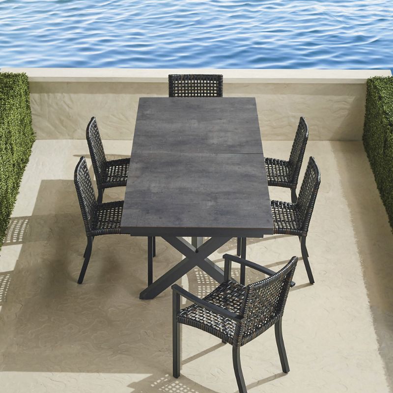 With a breathable open weave, our Isola Aluminum 7-piece Dining Set is the perfect fit for arid and coastal climates alike. Generously proportioned seating features a powdercoated aluminum frame. Then 3/4-inch-wide bands of Black Walnut-finished all-weather wicker are widely woven for visual and tangible lightness. Curved and rounded seats and backs comfortably cradle you and each of your guests.Part of the Isola Collection Isola 7-piece Rectangular Dining Set in Aluminum (173465): Includes Hartley Aluminum Expandable Dining Table, Four Side chairs and Two Armchairs (Note: Set only available as listed). All-weather wicker is handwoven over a powdercoated aluminum frame. Premium wicker construction resists mold, mildew, fading and splintering. Durable frame is powdercoated to protect against the elements. All-weather wicker has a Black Walnut finish. Frame is backed by an industry-leading 10-year structural warranty. For indoor or outdoor use. Arrives assembled. Imported. A Frontgate exclusive.