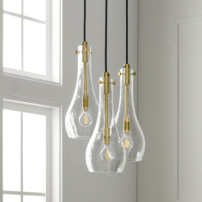The long, curved mouth-blown glass in this collection looks as if it is dripping down and spilling light. The clear, dimpled glass has a wavy texture, allowing light to pass through it - and reflect off of it - with subtle variations for a more dramatic effect. The aluminum accents and pipes have an antiqued finish, giving the modern profiles a slightly more nostalgic feel.Mouth-blown glassAluminum accents with antiqued brass finishDimmer switch4-1/4 ft. black fabric-wrapped power cordTakes three G16.5 40-watt bulbs or equivalent (sold separately)For indoor useDust with a soft, dry cloth or feather dusterImported. A Frontgate exclusive.