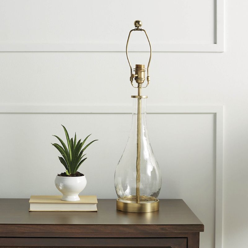 The long, curved mouth-blown glass in this collection looks as if it is dripping down and spilling light. The clear, dimpled glass has a wavy texture, allowing light to pass through it - and reflect off of it - with subtle variations for a more dramatic effect. The aluminum accents and pipes have an antiqued finish, giving the modern profiles a slightly more nostalgic feel.Mouth-blown glassAluminum accents with antiqued brass finishLinen drum shade (16" dia. x 11") 9 ft. black fabric-wrapped power cordTakes a G16.5 40-watt bulb or equivalent (sold separately)Dimmer switchFor indoor useDust with a soft, dry cloth or feather dusterImported. A Frontgate exclusive.