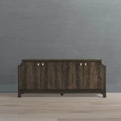 Four smooth cabinet doors showcase the figured and quartered mahogany veneer of our Langston Sideboard, creating a classic yet dramatic presence. The rich Dark Truffle finish is brightened by brass door pulls with a burnished finish. A cove silhouette, generous moldings and bracket feet complete the sophisticated exterior. Designed with utility in mind, the interior offers two adjustable shelves, plentiful storage and an integrated power strip with Type A and Type C USB ports. Part of the Langston Collection Durable solid mahogany frame is kiln dried to remove moisture, guarding against warping and cracking.. Figured and quartered mahogany veneer reinforced with hardwood and engineered wood.. Dark Truffle finish. Antique-burnished brass drawer pulls. Bracket feet. Two adjustable and removable shelves, flat on one side and slotted on the other for secure wine bottle storage.. Integrated power strip with Type A and Type C USB ports. Cord management system. Soft-close doors with adjustable hinges to ensure cabinet door alignment. Adjustable feet for leveling. Coordinates with Langston Dresser and Langston Bar Cabinet. Included anti-tip kit is required for installation; kit consists of safety-tested mounting hardware, a nylon strap and instructions.. To prevent injuries from furniture tipping over, this item must be permanently affixed to the wall; professional installation is recommended.. To prevent injuries or damage to item, recommended team lift (two or more people) for furniture placement.. Arrives assembled. A Frontgate exclusive.At Frontgate, our primary focus is quality. We guarantee that every product we sell will stand up to the supreme test our customers satisfaction. To learn more about our policies, visit our Shipping & Processing, Returns & Exchanges and Warranty & Price Guarantee pages.