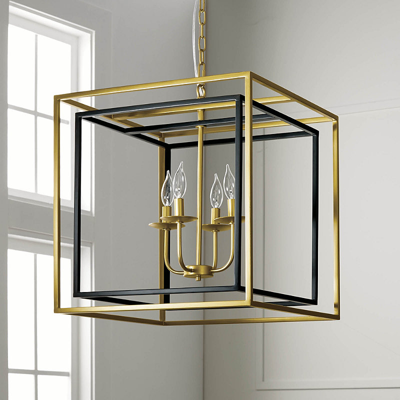 The sculptural cube-within-a-cube design and two different finishes give the illusion the lights are practically floating in the middle. This pendant will add lovely illumination with a magical flair to any room.100% iron7 ft. power cord; 7 ft. chainBrushed brass and matte black finishTakes four 40-watt candelabra-style bulbs or equivalent (sold separately)For indoor useWipe clean with a soft, dry cloth. A Frontgate exclusive.